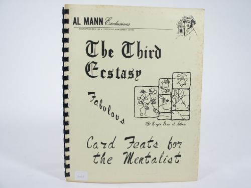 Al Mann Exclusives, The Third Ecstasy Fabulous Card Feats For The Mentalists. Gbc spiral bound, 34 pages, illustrated. Chapters on: *A Tractate On Fabulous Card Effects For The Mentalist *The Pros and Cons *Do's And Don'ts *Flight Of The Psycards *Domination Of Thought *Caster And Pollux by John Smetana *The Devastators by Al Mann *The Invaders *The D-Esp-Erados *The Third Extasie *Astral Sight *The Mounds Of Ishtar *The Psychic Poker Player *Forces-Reverse Pan Force-Isomeric Card-Forces Within-Cut Force *The Master Of The Cards *Olof Jonsson's Card Feats *Spectator Becomes The Mindreader *Mind Control *Clairvoyance *Levitation *Teleportation *Seeing Through A Brick Wall *Sensative Finger Tips And X-Ray Eyes. Condition private collection identifier label to cover, foxing to covers and top page edges, otherwise very fine.