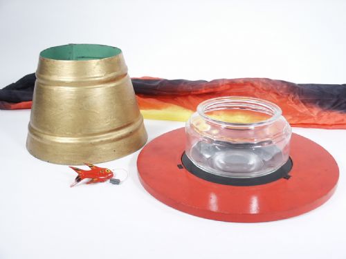 A tray is shown with something wrapped on it and removing the silk a truncated cone is shown empty and this is replaced on the tray. Reaching through the cone the silk is pulled up through to further prove its emptiness. The cone is removed and a fishbowl filled with colored water or real goldfish has made its appearance! The tray measures 11 3/4" in diameter and made of solid wood. The cone is of metal and fishbowl measures 6" in diameter. The silk is 36" in size. Includes instructions. Condition overall very good.