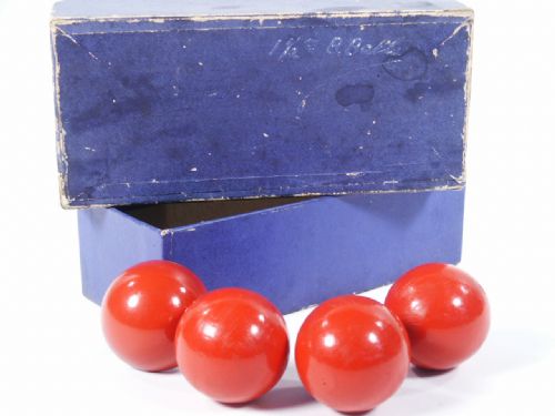 A set of multiplying Billiard Balls 1 1/2" in size which consists of three solid wood balls and one metal shell. Includes instructions. Condition box worn, one ball has touch up to some paint absence, otherwise fine.