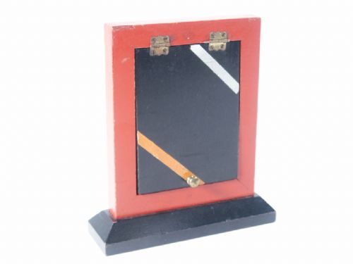 A small frame with two hinged doors is shown from both sides. The front door is lifted up by the small knob and frame is held up by the lifted door. The frame is turned upside down showing the inside. Closing the rear door and turning the frame with base down the second door is closed and frame is set upon the table. A card is chosen and caused to vanish by any method desired. Upon lifting the front door the card is seen resting against the back door! This is made of wood and stands 6 1/8" high. Includes illustrated instructions. Condition good used.